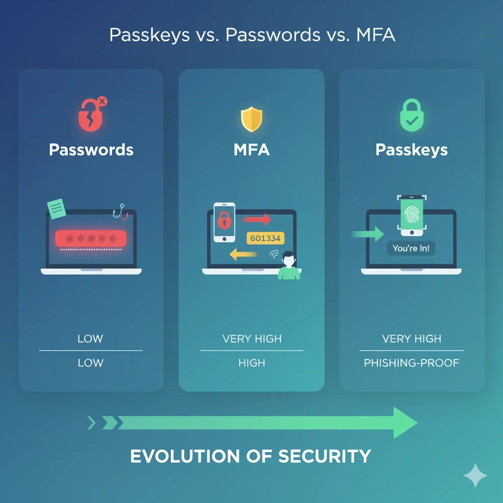 | Feature | Passwords (Alone) | Traditional MFA (Password + Code) | Passkeys |